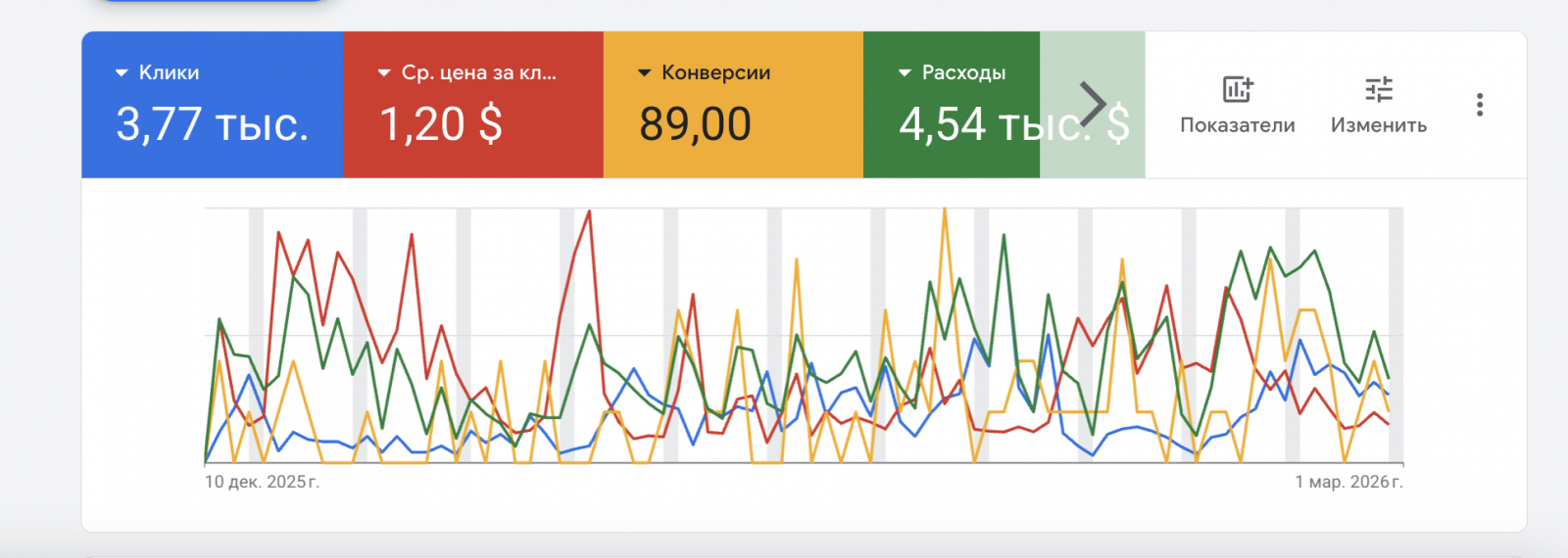 Таким образом, постоянными итерациями осуществляется оптимизация рекламы и тестируются новые гипотезы. Если говорить про направления бизнеса - главный вывод в том, что во многом именно рынок диктует правила, так как любая реклама - это конкурентная среда, и нужно уметь под нее подстраиваться. А погружаясь детальнее в рекламный кабинет, здесь не думаю, что открою секретов, если скажу, что весь маркетинг упирается в тесты. Вот например показатели Перфоманс Макс на скрине, где к сожалению видно не всё, но трафик фактически 50/50 распределяется между Поиском и КМС.