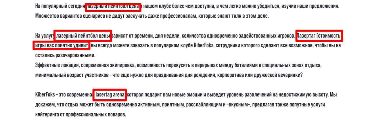 Проверьте свои сайты на наличие таких, ни-о-чем-ных, водянистых текстов. Они вам не помогают. Ключевые слова, да, нужны - они делают страницу релевантной- но не в таком же кустарном виде [ведь таким образом тупо отталкиваем читателя - а он ведь потенциальный клиент].