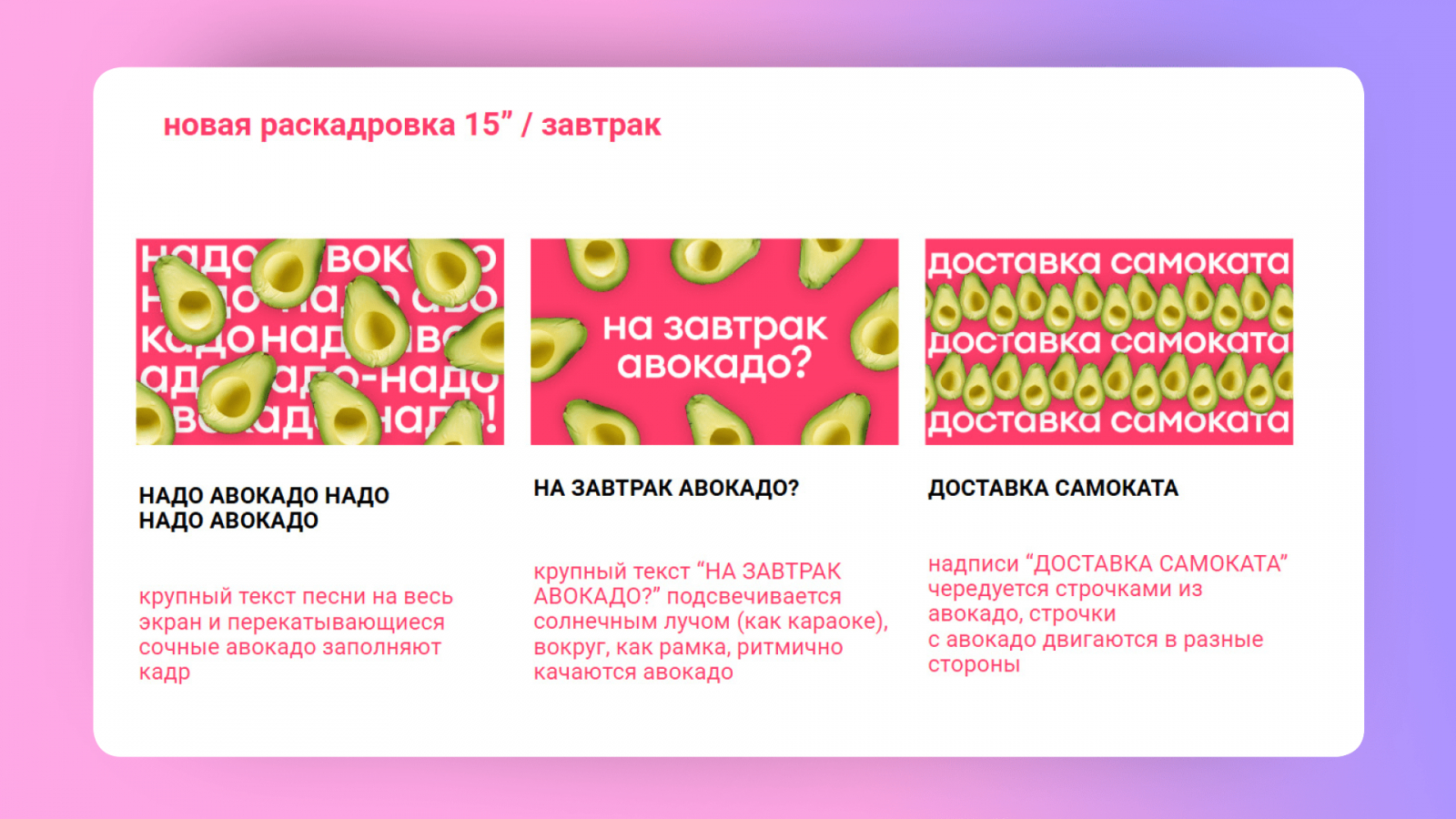 Сначала мы выбрали тему, количество и длину роликов. Остановились на трёх сценариях, где может пригодиться авокадо: перед тренировкой, на завтрак и во время готовки салатов. Ещё прописали задумку для общего видео без привязки к сюжету. Концепции подходили для роликов по 10–15 секунд.