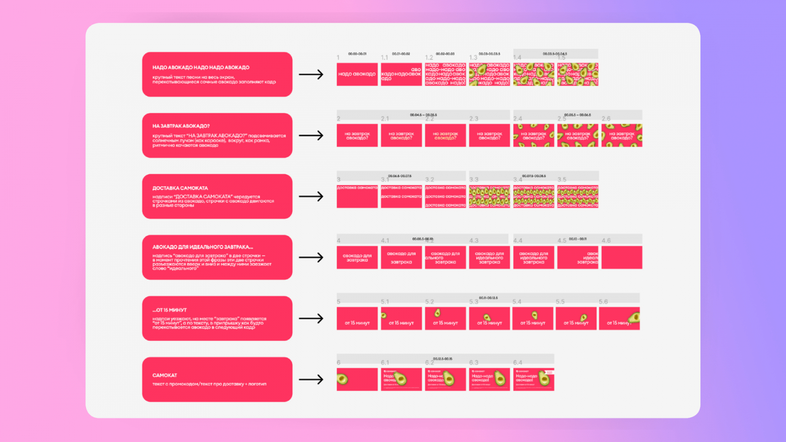 Затем сверстали раскадровку роликов. За 10–15 секунд нужно и донести суть, и замотивировать зрителя на покупку. Тут важно, чтобы каждый кадр работал на задачу. Для этого мы подробно описали, как будет меняться визуал в видео.