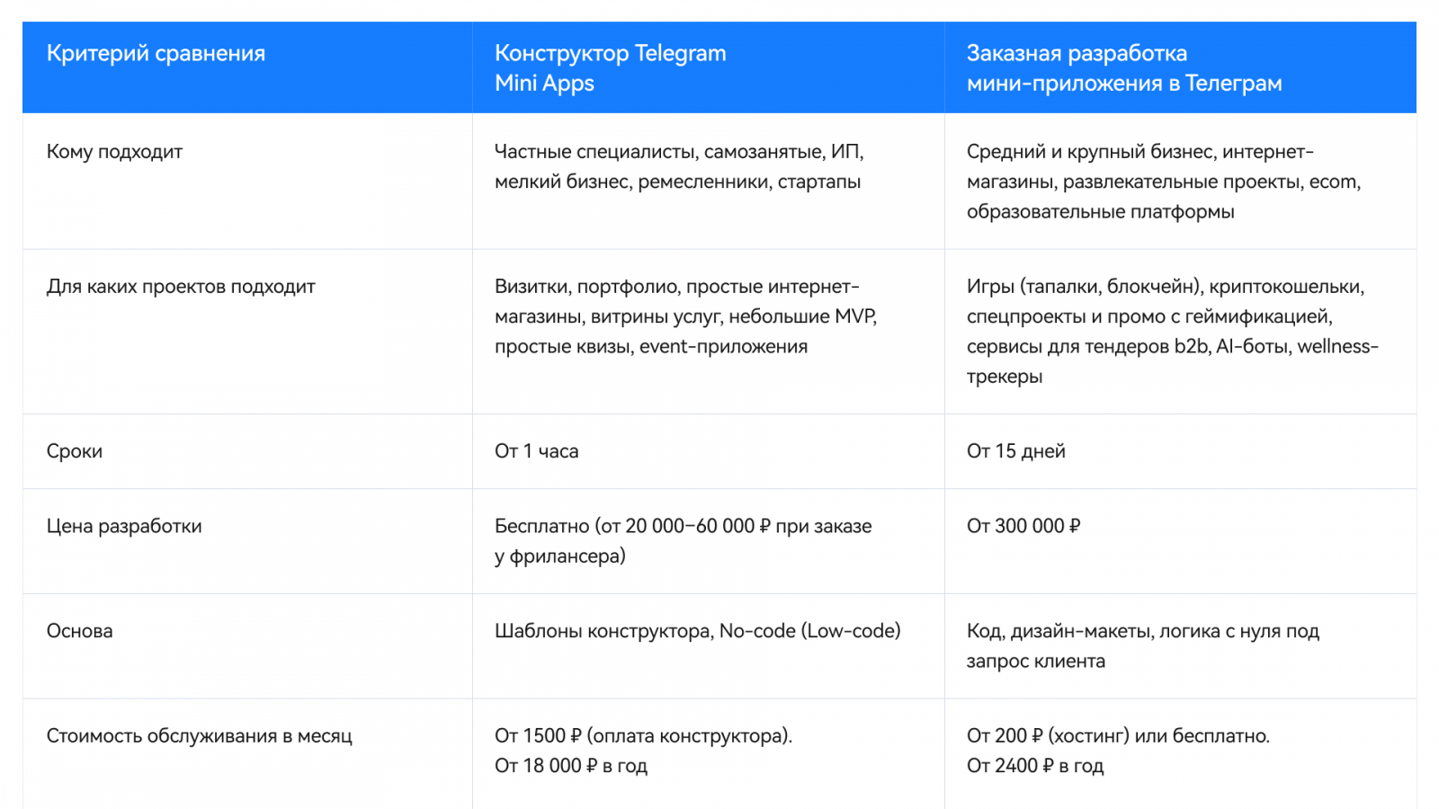 Конструктор Telegram Mini Apps — простое и утилитарное решение для малого бизнеса и ИП. Для enterprise-компаний оно не подходит. Как правило, крупным компаниям нужен полноценный продукт, чтобы физически и юридически он полностью принадлежал им и крутился в их IT-контуре.