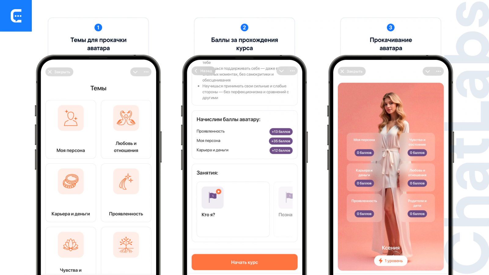Когда курс с психологическими практиками завершен, обучающийся получает баллы. Эта награда прокачивает аватар, выступает элементом геймификации и способом повысить доходимость (метрика COR, Completion Rate). Но важно не только чтобы пользователь завершил курс и ушел из приложения и клиентской базы. Необходимо заложить в UX-сценарии: