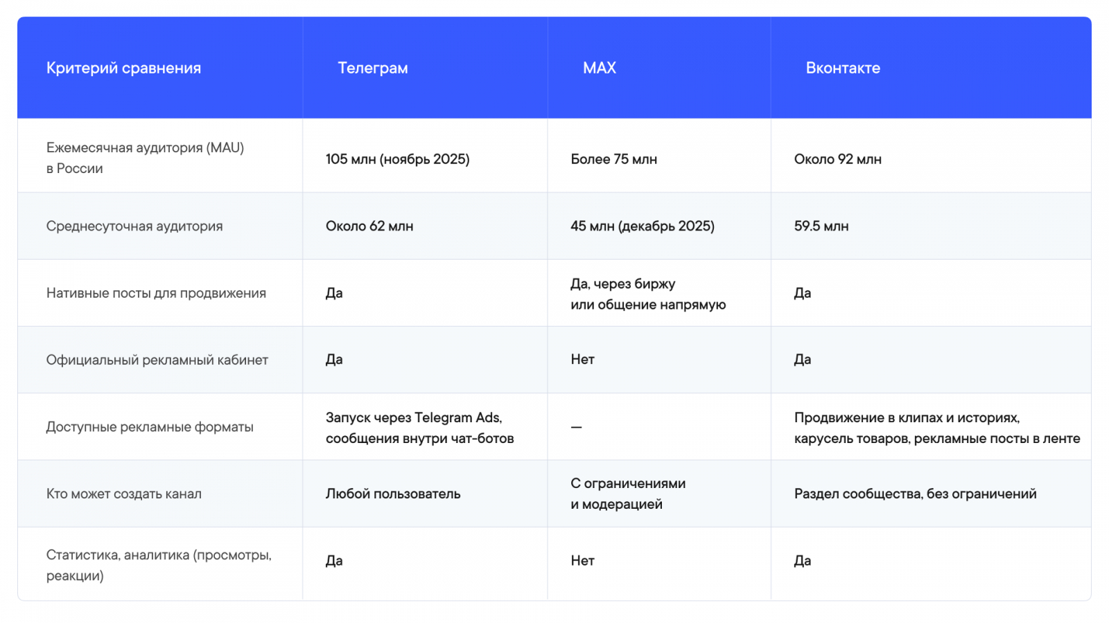 В 2026 г. MAX продолжит набирать аудиторию в России. Каналы, чат-боты и мини-приложения в МАКСе могут стать дополнительным онлайн-инструментом маркетолога. В то же время остается Телеграм с активной аудиторией, каналами, инструментами рекламы и продвижения.