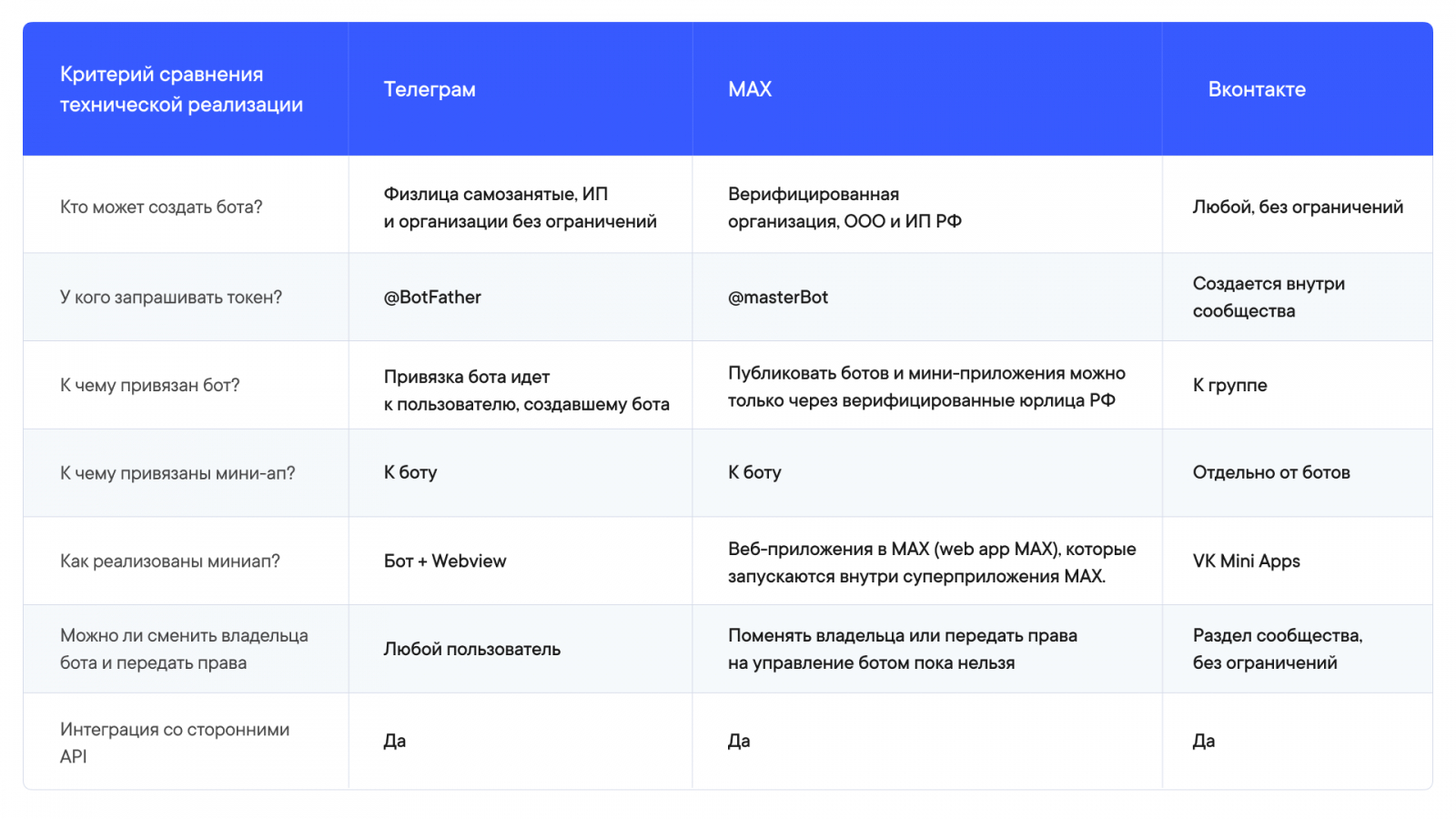 Технически разработка ботов и Mini Apps для MAX сложнее: нужно подтверждать данные юридического лица или ИП, ожидать модерацию, продумывать владельца бота (нельзя передать права).