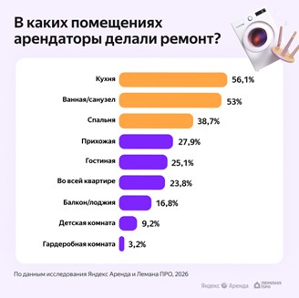 Причем чаще всего арендаторы вносят изменения или даже полностью ремонтируют в съемном жилье кухню (56,1%), ванную и санузел (53%). Чуть реже делают ремонт в спальне (38,7%), прихожей (27,9%) и гостиной (25,1%), а 23,8% делают ремонт во всей квартире. Реже всего арендаторы вносят изменения в балкон или лоджию (16,8%), детскую комнату (9,2%) и гардеробную (3,2%).