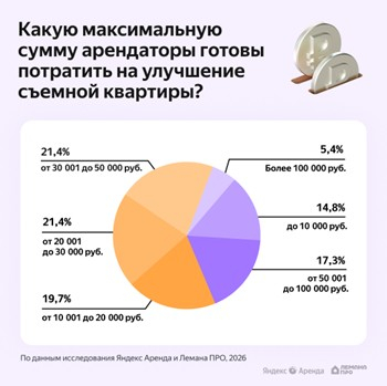 При этом каждый пятый (21,4%) квартиросъемщик отмечает, что готов потратить на обновление жилья в течение года от 20 до 30 тыс. рублей. Еще столько же (21,4%) — от 30 до 50 тыс. 19,7% опрошенных готовы вкладывать в ремонт от 10 тыс. до 20 тыс. рублей, а 14,8% - до 10 тыс. рублей в год. Есть и те, кто потенциально готов потратить и более крупные суммы: 17,3% арендаторов рассматривают возможность потратить от 50 до 100 тыс. рублей, а 5,4% готовы даже превысить лимит в 100 тыс.