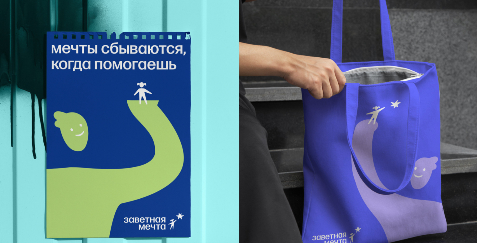 Наивная графика стала популярной из-за усталости дизайнеров и всех вокруг от строгости минимализма. И если раньше к ней прибегали только те бренды, которым это максимально уместно, то сегодня такие примеры можно увидеть и у вполне «серьезных» брендов, вроде банков и промышленных гигантов. Сегодня наивная графика считается хорошим тоном, подчеркивает человечность и современность брендов. По двум последним причинам мы использовали такой подход в ребрендинге благотворительного проекта «Заветная мечта». В рамках этого проекта, дети с онкозаболеваниями могут реализовать свою мечту о заветной профессии, волонтеры и другие небезразличные к этому люди помогают им с этим. Нам было важно подчеркнуть эмоциональность и значимость проекта, поэтому в графике появились маскоты в виде девочки и доброго великана.