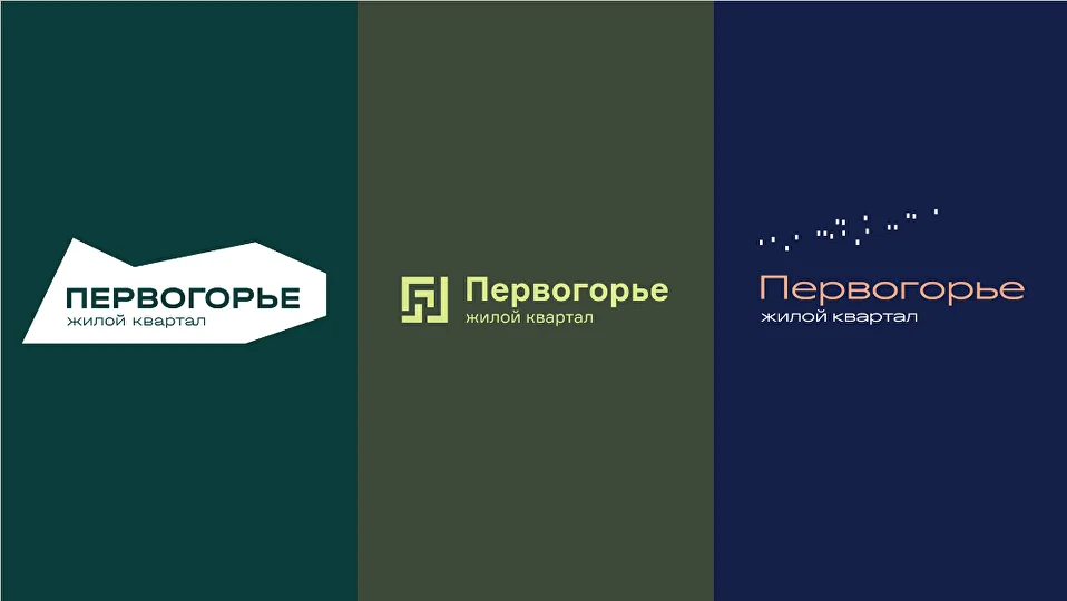 Помимо нейминга мы разработали три направления айдентики, каждое из которых так или иначе базировалось на связи с Республикой Алтай. В первом варианте логотип напоминал очертания ЖК на карте и горы одновременно. Во втором в логотип были вписаны буквы «П» и «Г», цифра «1» и упрощенное изображение гор, схема квартиры или квартала и тамга — родовой фамильный знак (печать), который ставился на родовом имуществе. В третьем варианте логотип дополняется скоплением звезд, которые одновременно выглядят как светящиеся окна домов.