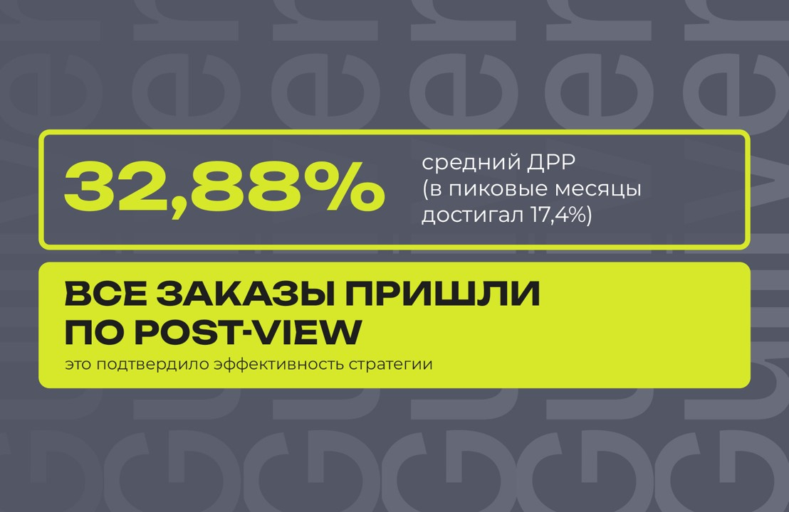 Благодаря детальному таргетингу, множеству A/B-тестов и постоянной оптимизации нам удалось снизить ДРР в 2 раза в период высокой сезонности и обеспечить стабильный поток заказов. Клиент остался доволен результатами кампании и продолжает сотрудничество с нами по этому направлению в 2025 году.