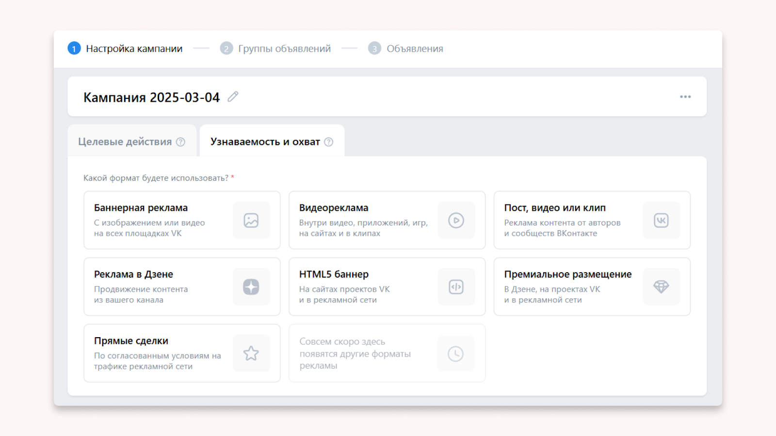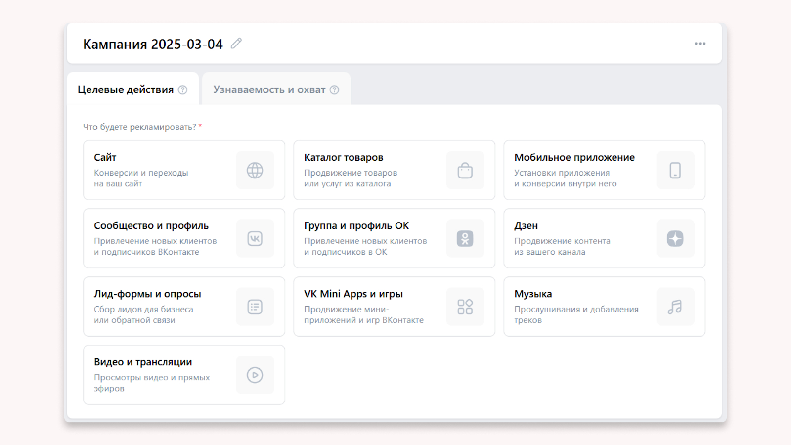 Например, цель — получить просмотры на видео, то сделать это можно через вкладку “Узнаваемость и охват”. А если хотите получить лиды, то через “Целевые действия”.