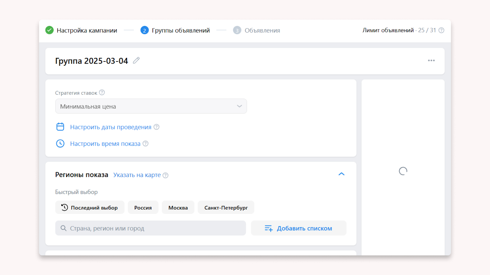 Выбираете “Продолжить” и попадаете на вкладку “Группы объявлений”.