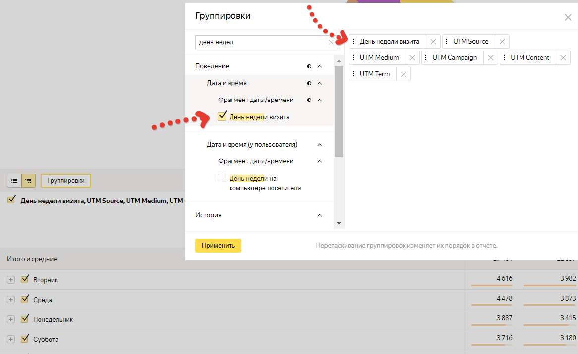В первую очередь нас интересуют дни недели. Поэтому идём в группировки и на первую позицию ставим «День недели визита».