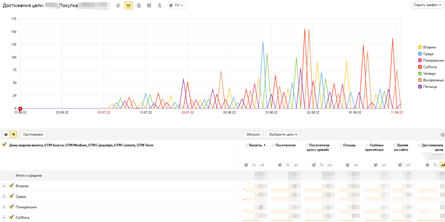 После того как мы настроили фильтр по UTM меткам, можно увидеть, как различные дни недели влияют на эффективность конкретной рекламной кампании. Это особенно полезно, если вы хотите понять, как изменяются результаты в зависимости от дней.