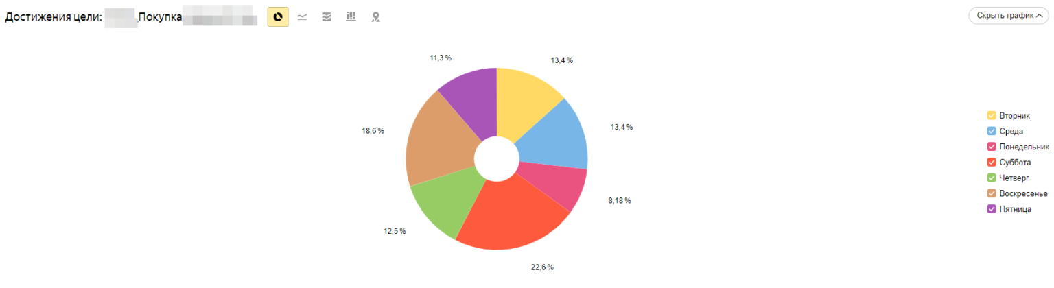 Поэтому меняем тип графика на круговую диаграмму, которая группирует данные по целям за всё время и покажет вклад разных дней недели в достижение.