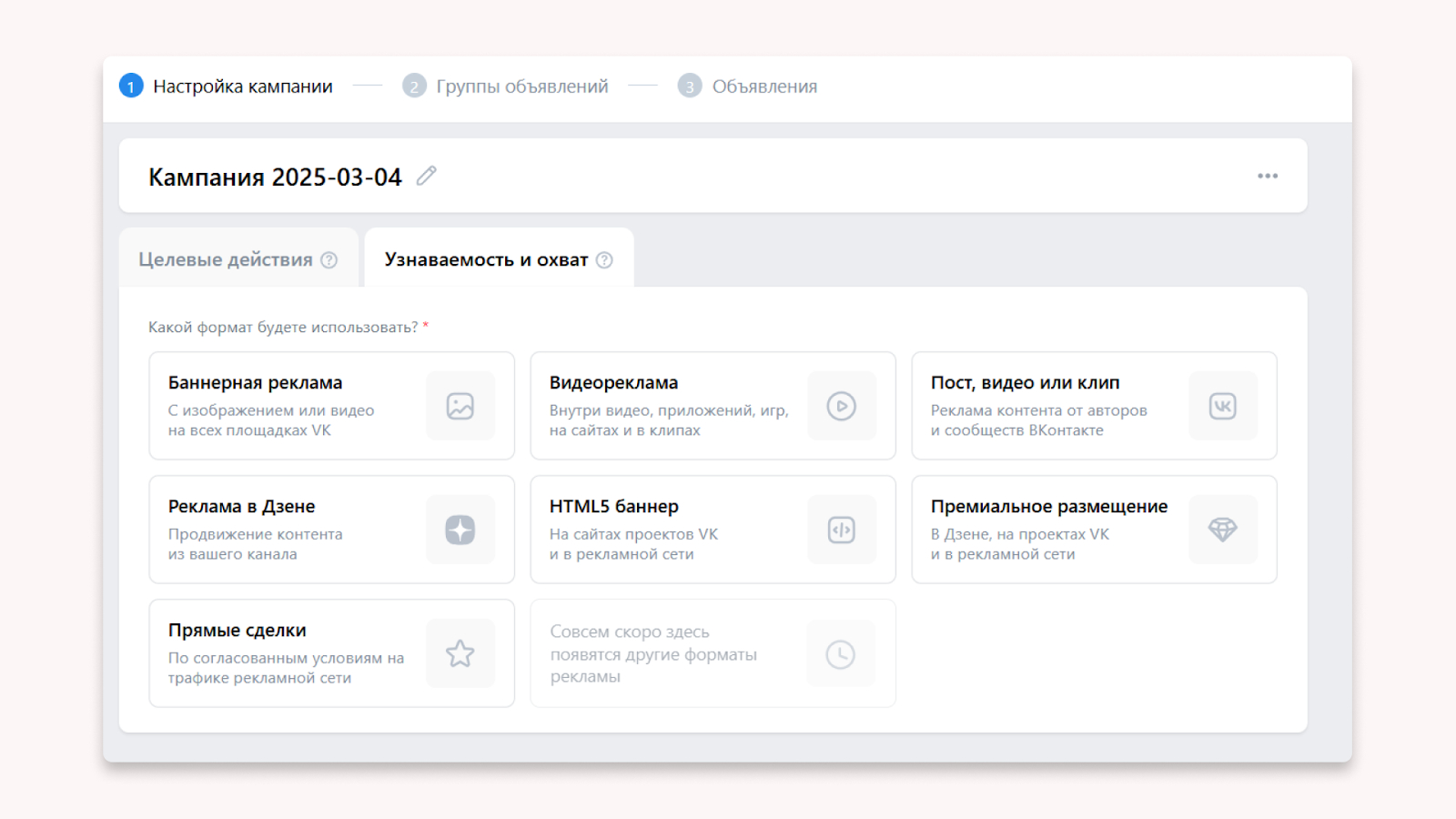 Откроется окно с настройками, где нужно выбрать между “Целевые действия” и “Узнаваемость и охват”.
