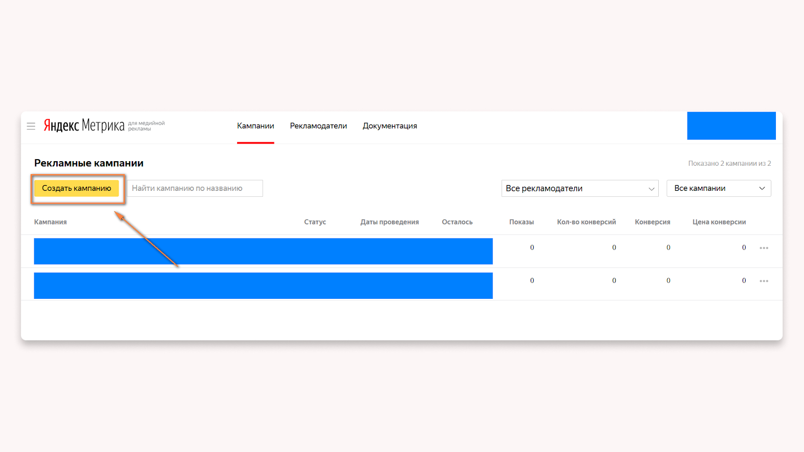 Переходим на вкладку “Кампании” и выбираем “Создать кампанию”.
