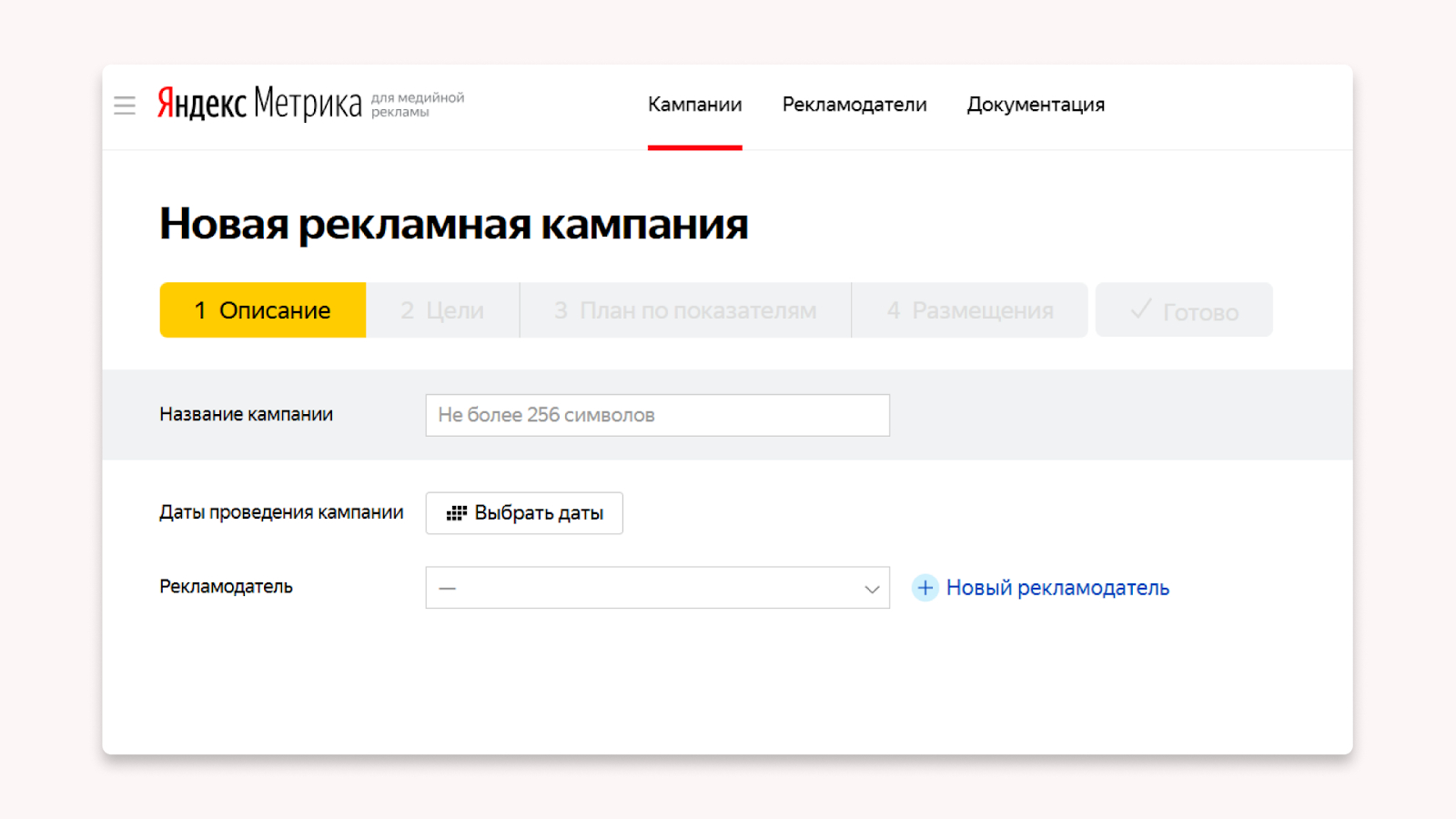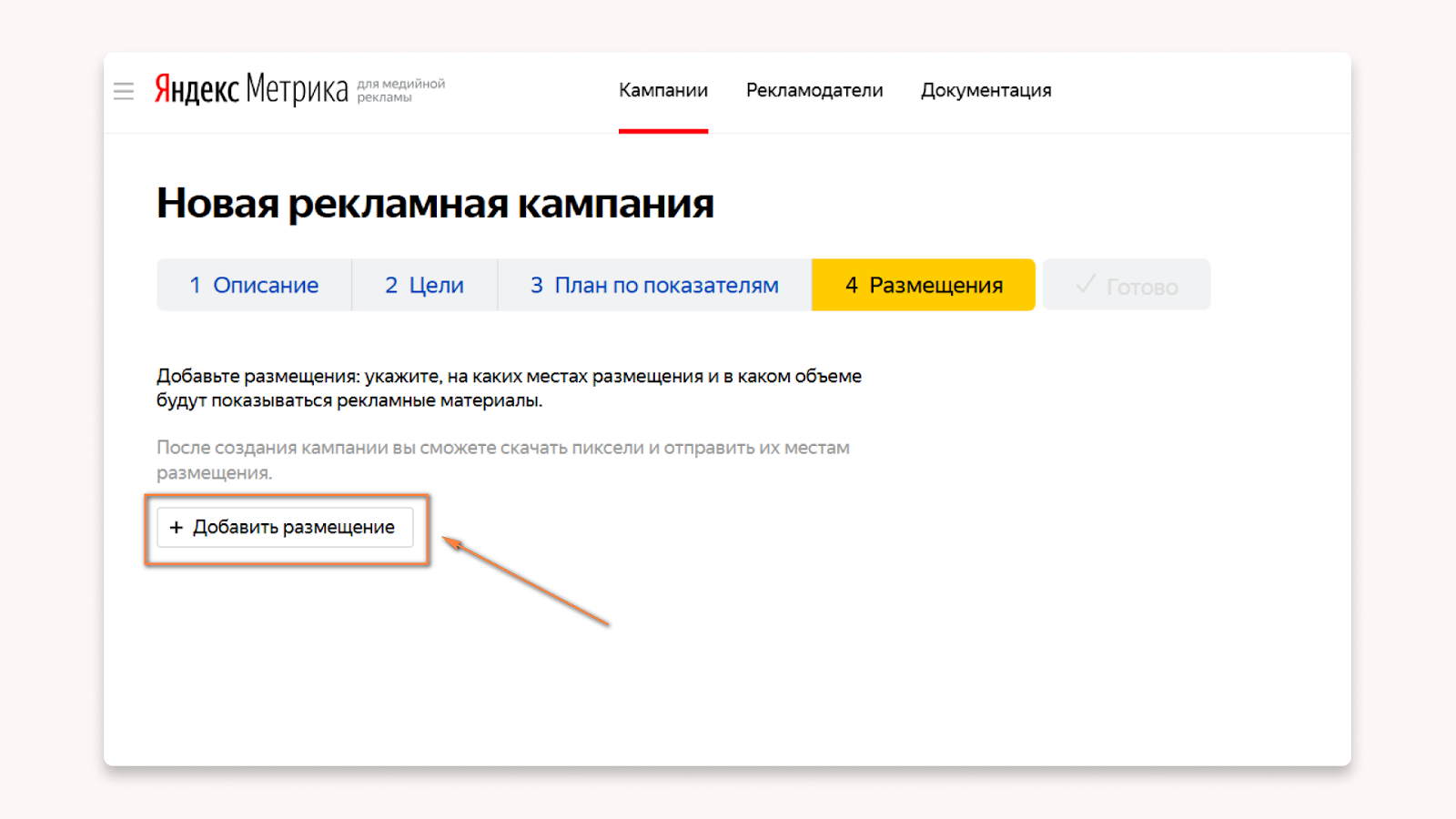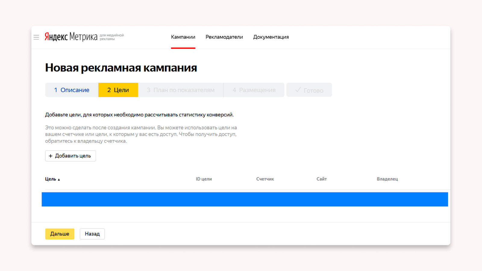 На этапе заполнения “План по показателям” добавляю только ключевую цель кампании (такую же, как и на предыдущем шаге). Если вы ранее составляли медиаплан и имеете чёткое представление о предварительных конверсиях, можно это всё прописать подробнее. Но в данном примере я не буду на этом останавливаться.