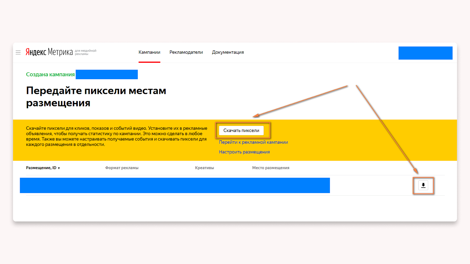 Когда все поля заполнены, нажмите “Создать кампанию”. И у вас появится возможность скачать пиксели. Скачиваем.