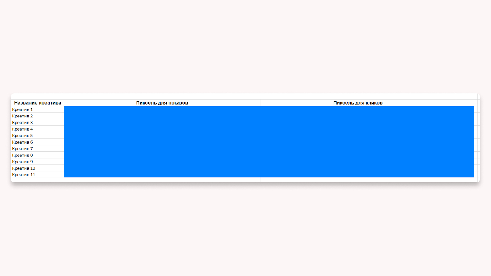 Открываем скачанный документ с пикселями и видим, что каждому креативу присвоен своей пиксель для показов и для кликов.
