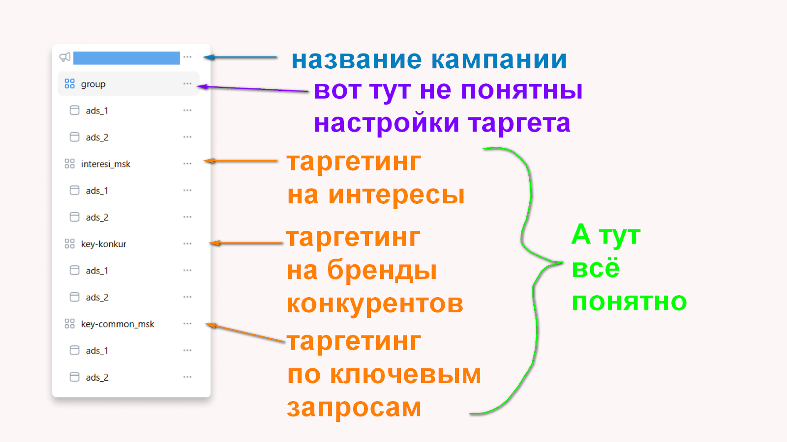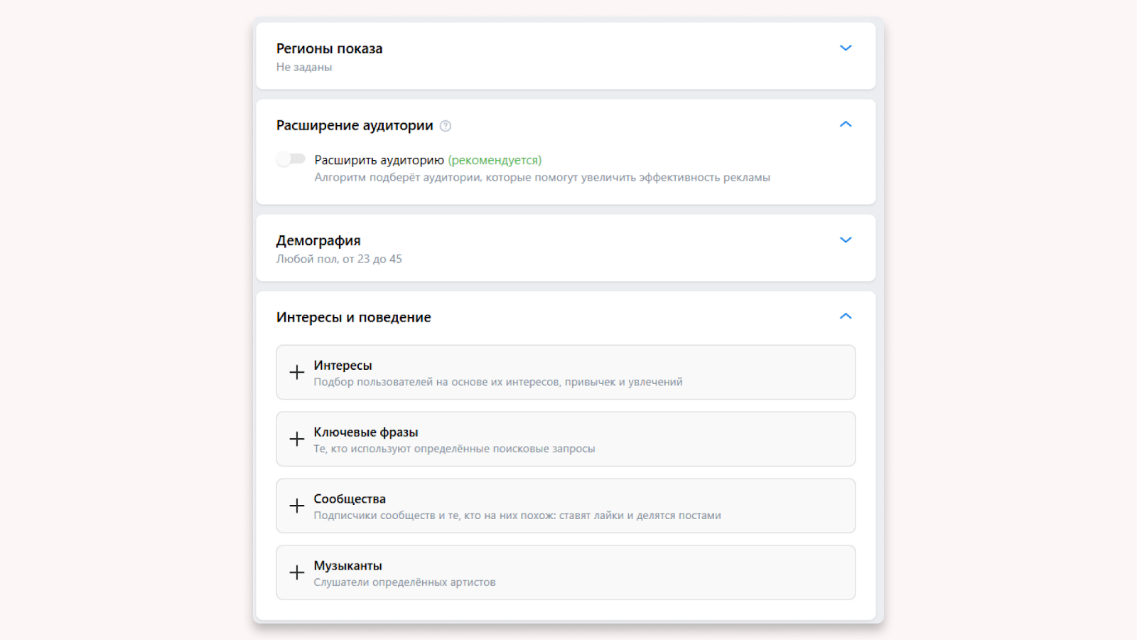 Совет: чтобы понять, какие из таргетов лучше работают, я рекомендую под каждую категорию из блока “Интересы и поведение” создавать новую группу.
