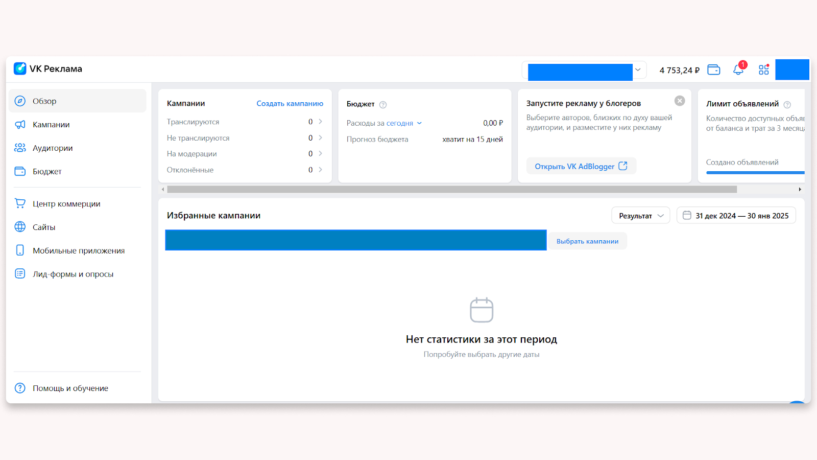 Чтобы создать рекламную кампанию, зайдите в рекламный кабинет. Если его нет, понадобиться зарегистрировать.