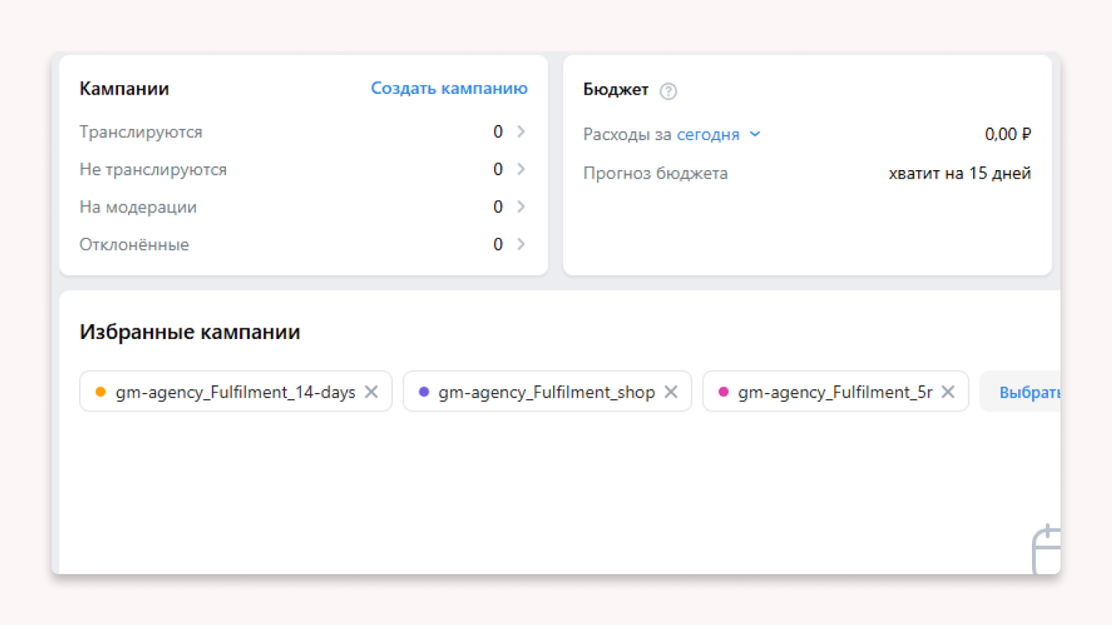 Основную часть экрана занимает сводка по кампаниям. Для быстрого поиска можно использовать фильтры или поисковую строку, которая находится чуть выше слева. Иконка календаря рядом с датами, расположенная правее, позволяет отобразить информацию по рекламе за выбранный период.