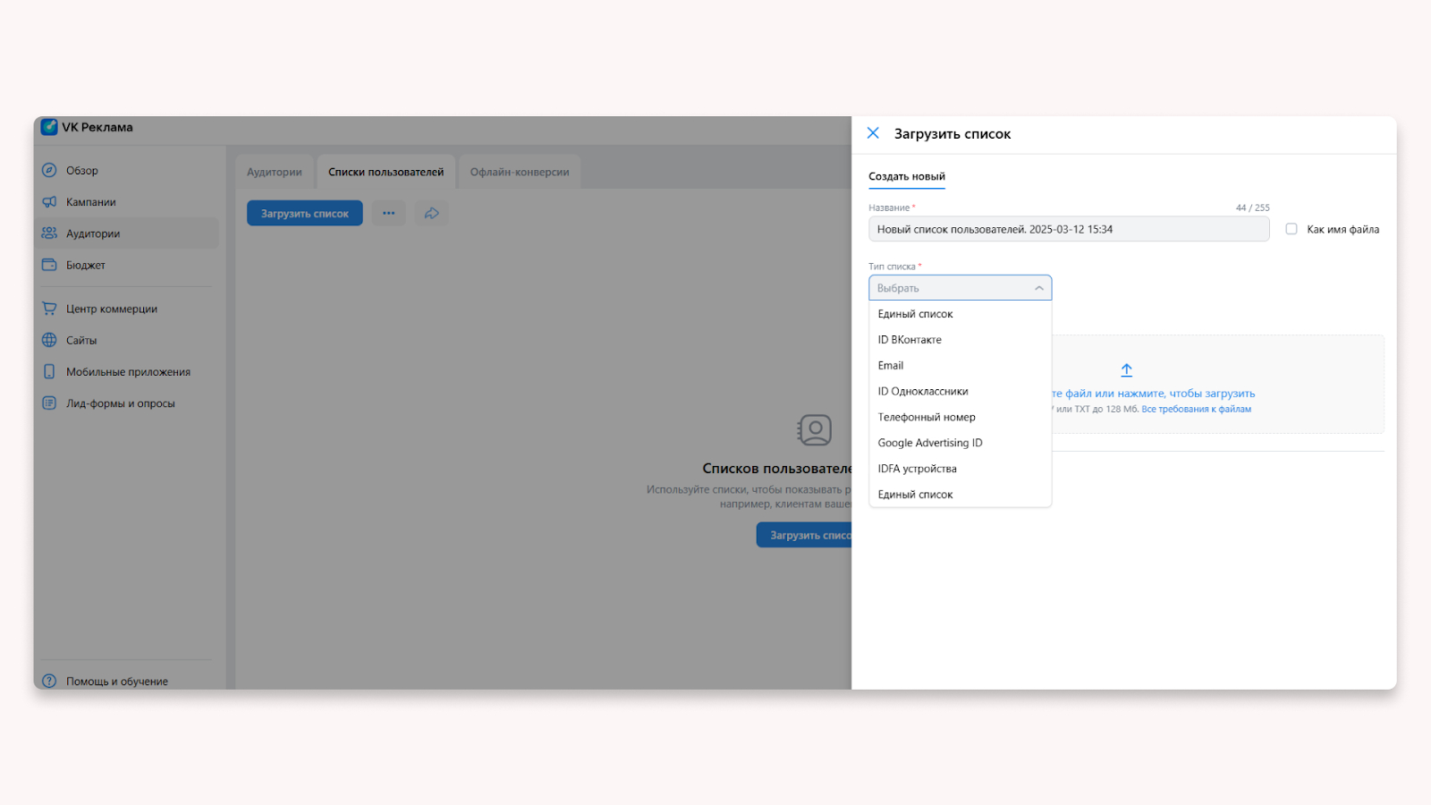 Но тут также можно загрузить номера телефоном, ID устройств, базу email и прочие варианты таргетингов. Эта информация откроет новые возможности для показов рекламы и взаимодействия с ЦА.