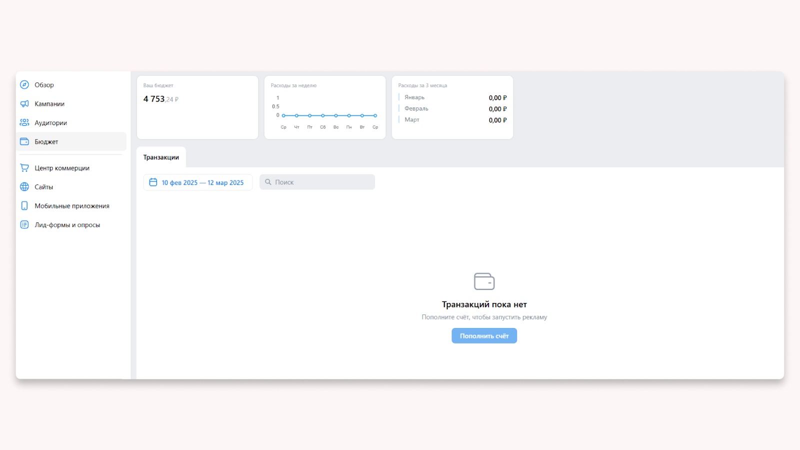 Тут собрана вся информация о пополнениях и списаниях рекламного кабинета.