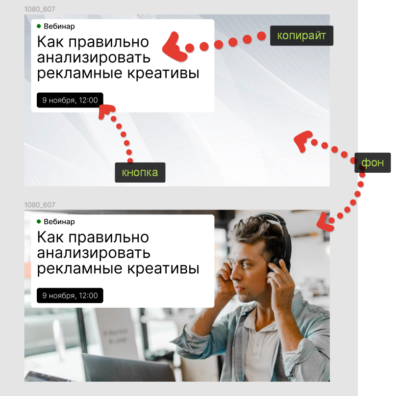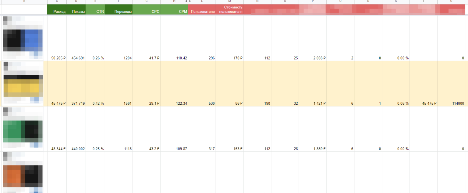 Чтобы не быть голословным, приведу пример одного моего проекта, где я тестирую много разных креативов и в результате отдаю направлению дизайна данные до элементов баннеров.