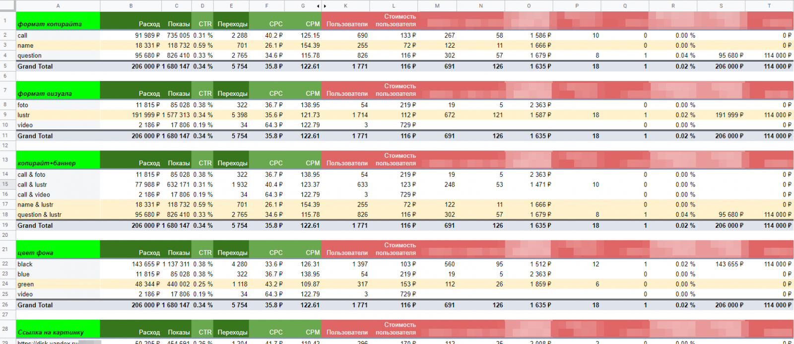 Если вы думаете, что я трачу уйма времени на сбор таких отчёт — вы ошибаетесь. Это сводные таблицы, которые формируются автоматически на большом адсете данных. Самое сложное и долгое, это всё настроить. Потом вы только обновляете циферки по новым запускам и изучаете результаты.