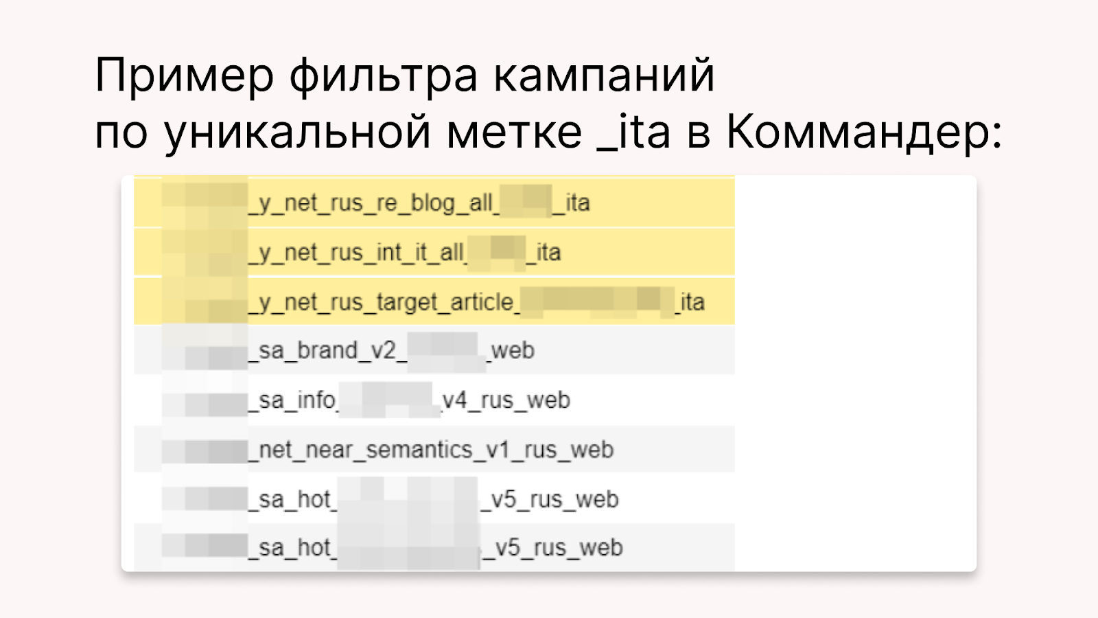 Уникальное название рекламной кампании — это ключ к пониманию её структуры. Например, оно может показывать, на кого настроена кампания, на каких площадках или полигонах и т.д. Чтобы уже из названия можно было вытащить полезные данные.