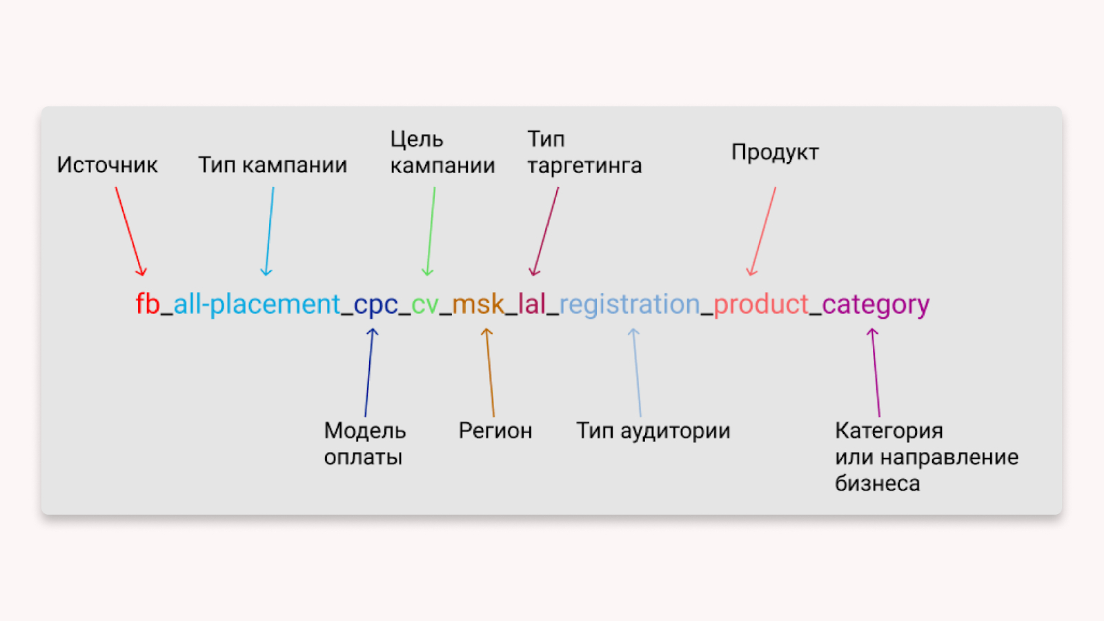 Например, название кампании yandex_cpc_arenda говорит о том, что оплата происходит за клик, но “arenda” может значить что угодно. Например, аудиторию арендодателей или сегмент ключевых слов.