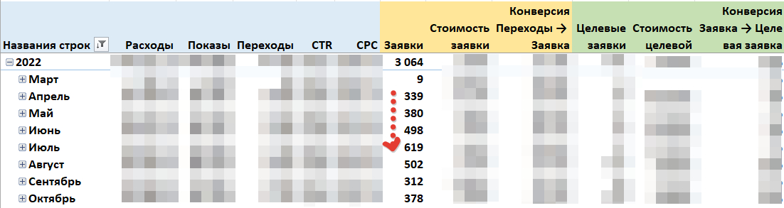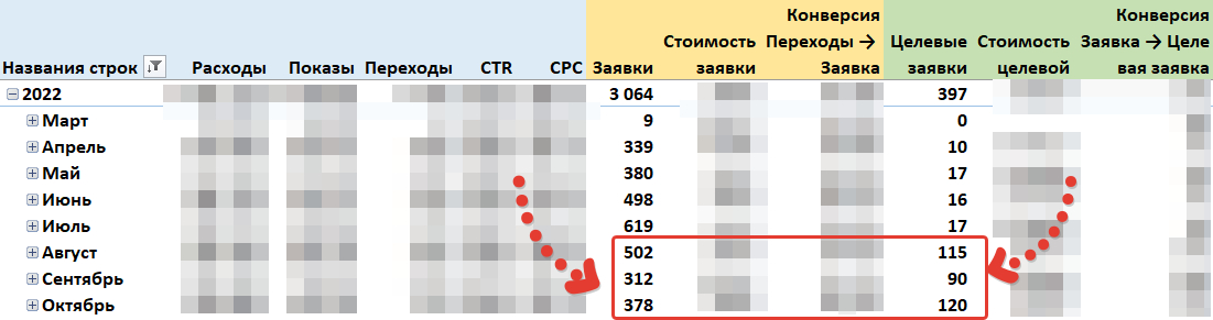 На скрине ниже видно, что сначала был рост заявок, потом падение. Но именно в момент падения общего количества заявок стало расти их качество в статус «целевая».