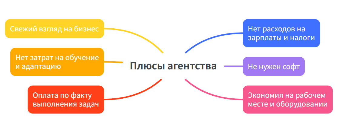 К тому же, агентства работают с разными нишами и клиентами, поэтому обладают широким опытом. В их команде — специалисты по контекстной рекламе, SEO, SMM, таргету, копирайтингу и аналитике. Это избавляет бизнес от необходимости нанимать и обучать сотрудников.