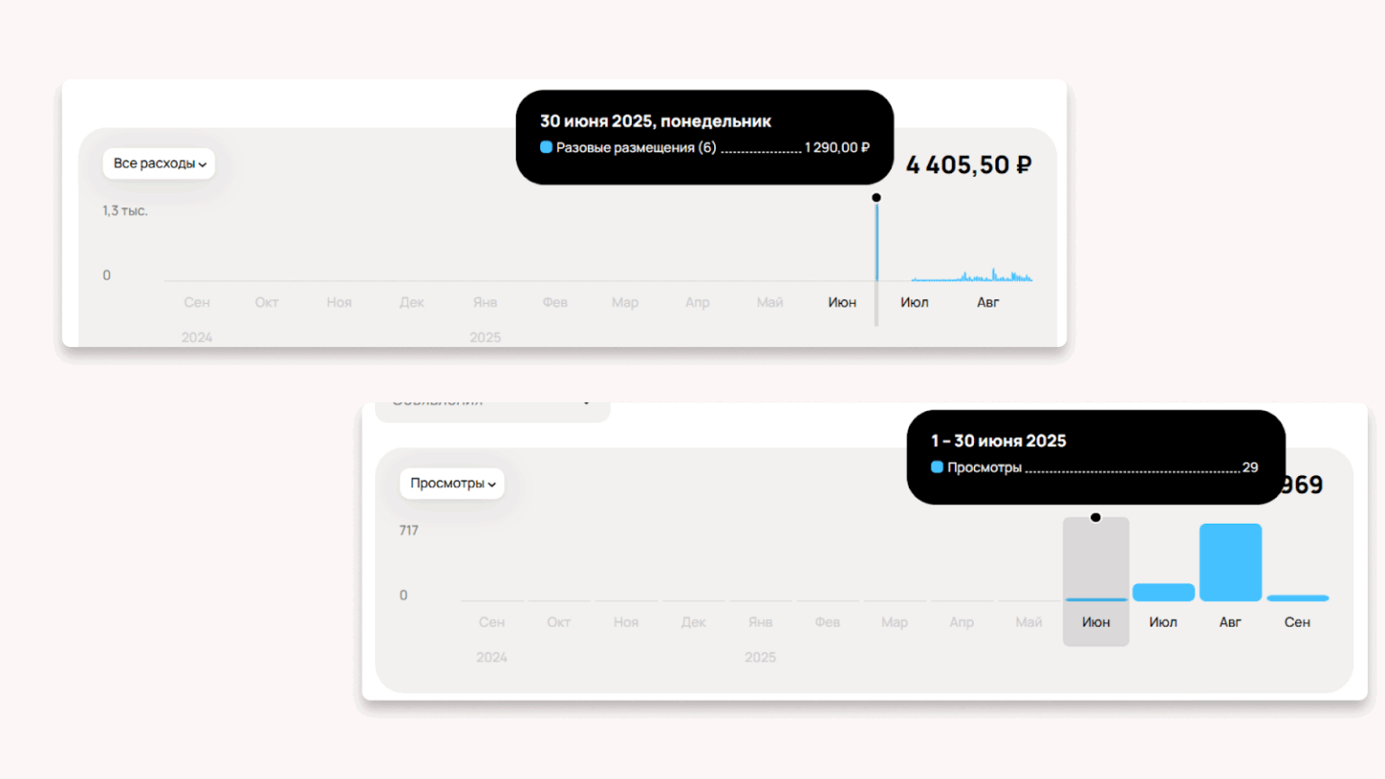 В моём примере мы потратили разово за размещение 6-и объявлений в разных категориях 1290 руб. За эти деньги получили 29 просмотров. Т.е. 44,48 руб за просмотр.