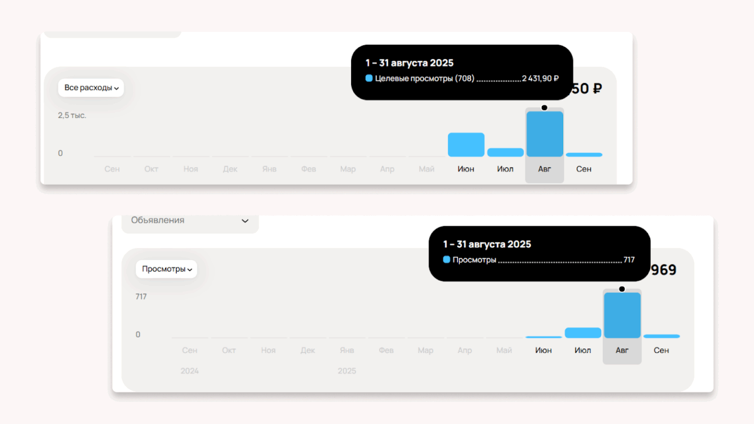 Можно просмотреть информацию за конкретный период, в определённой категории, по конкретному гео, конкретному объявлению, сотрудникам, дням. Система автоматически сравнит выбранный период с аналогичных прошлым и выведет данные.