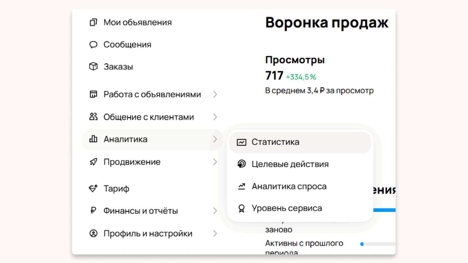 Тут нам также помогут внутренние инструменты Авито. Для этого в меню слева найдите “Аналитика” -> “Статистика”.