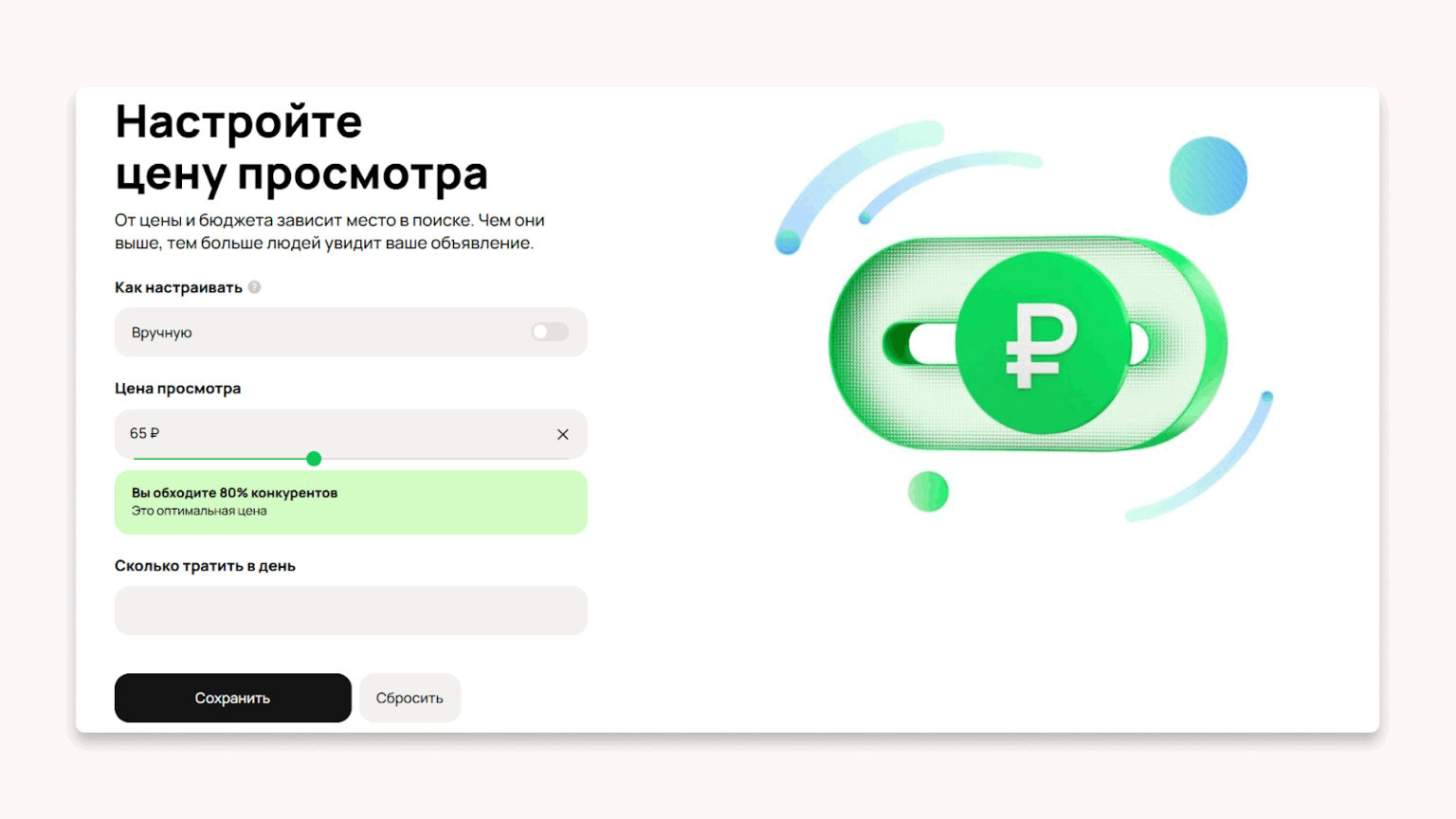 Тут вы можете выбрать ручные или автоматические настройки. В первом случае вы можете повысить стоимость просмотра, ориентируясь на подсказки Авито. К тому же, здесь есть возможность установить ограничения по тратам в день для конкретного объявления, что позволяет не слить бюджет впустую.