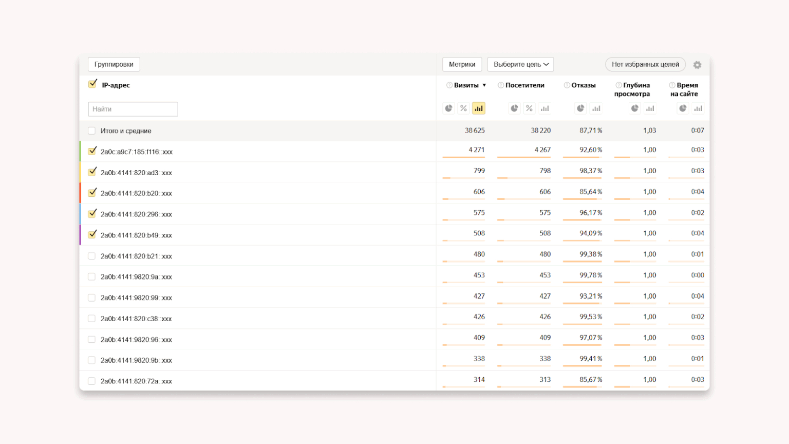 В Яндекс Метрике и Google Analytics можно сегментировать трафик по IP-адресам. Если видите десятки уникальных посетителей с одного IP — это явный признак накрутки.