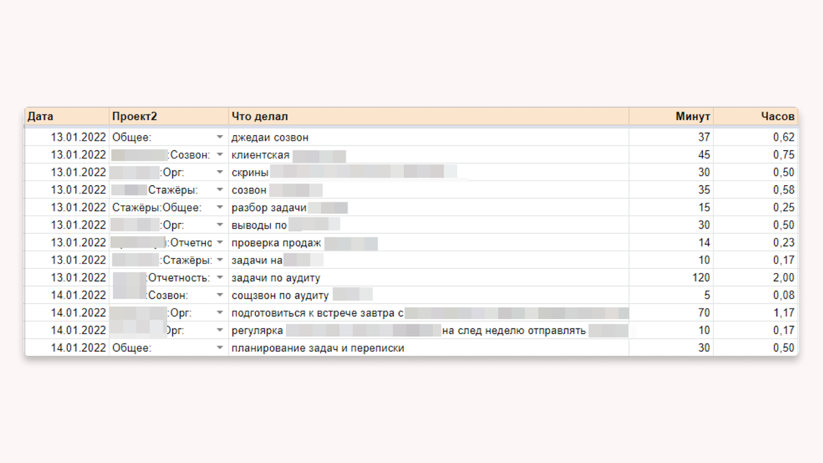 Как и в прошлом случае, данный шаблон превращает абстрактное «я много работаю» в холодную статистику: сколько часов ушло на создание контента, сколько — на общение с аудиторией, а сколько — на административные дела.