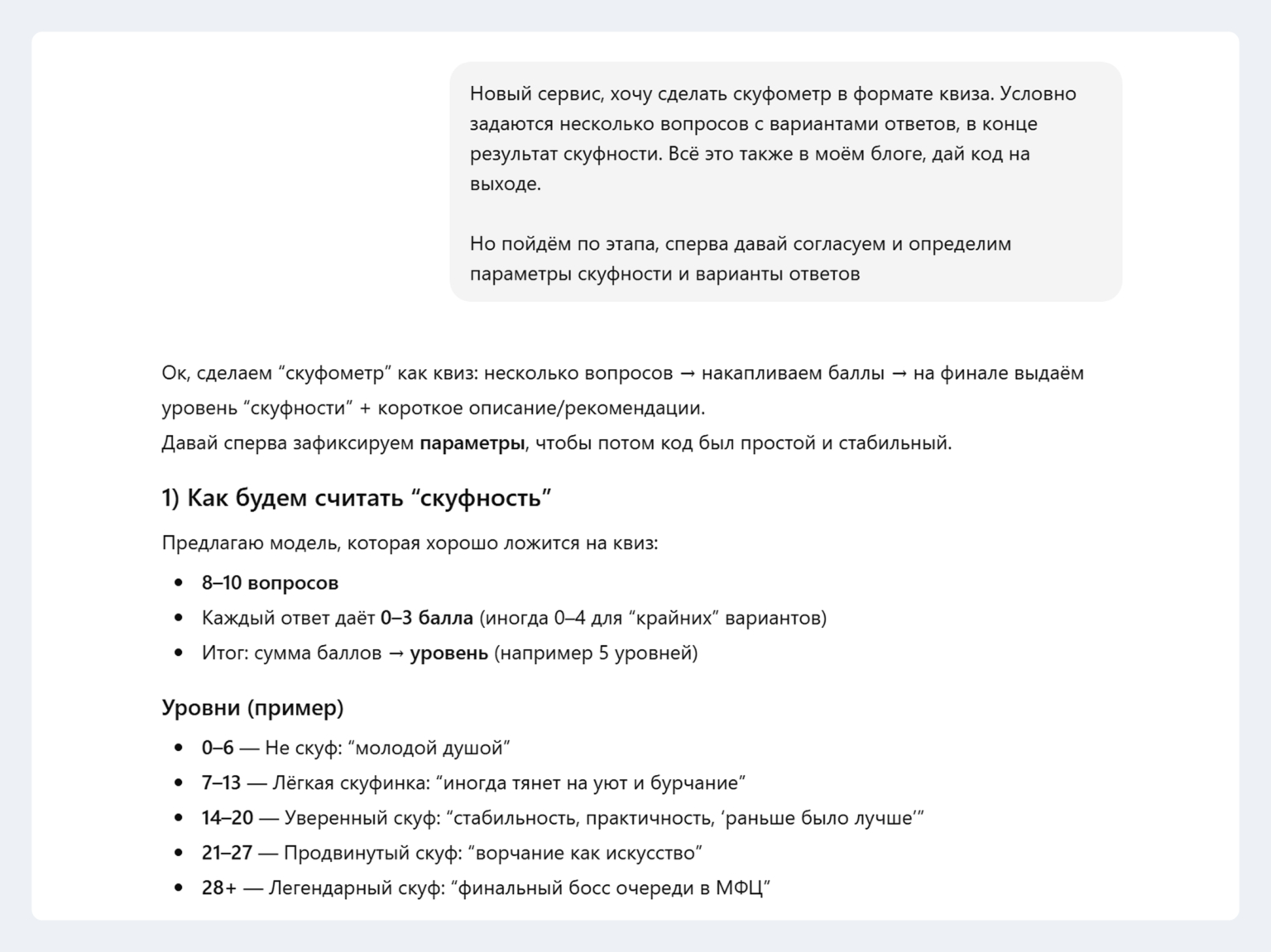 Мой самый быстрый эксперимент — простой сервис «Скуфометр». Буквально за 15 минут я придумал идею, попросил ИИ написать логику и код, сгенерировал картинку и опубликовал страницу.