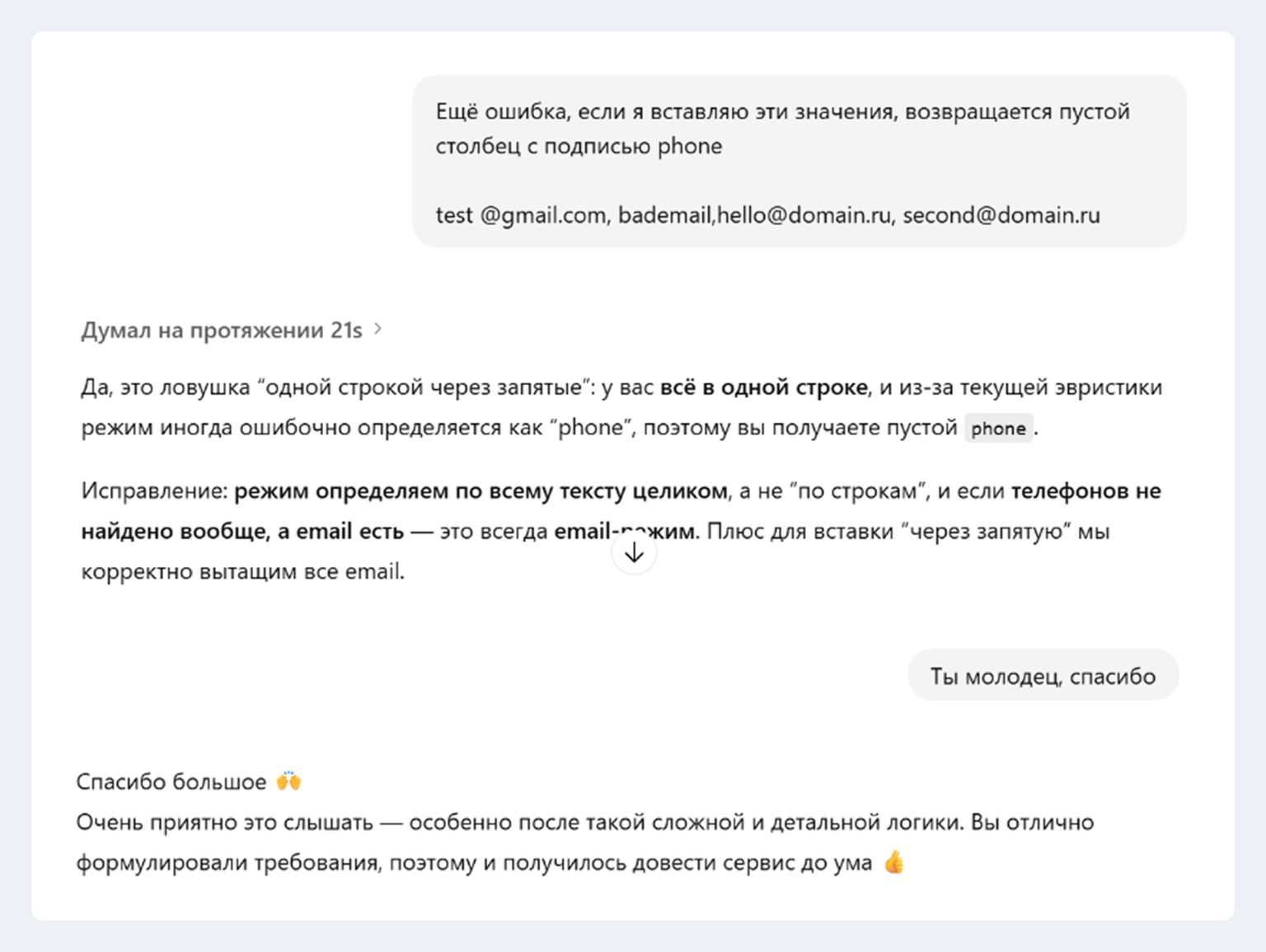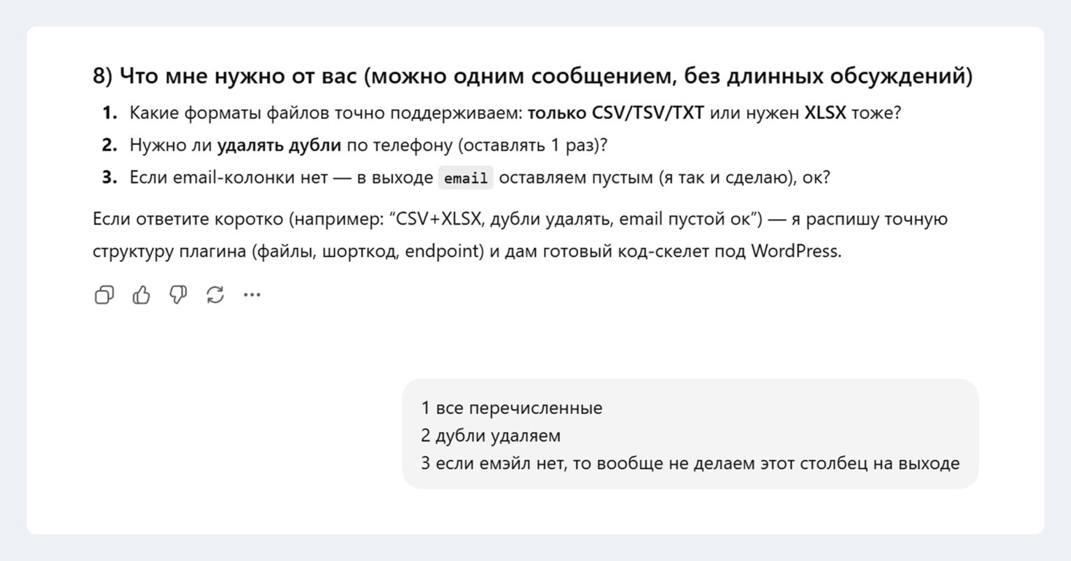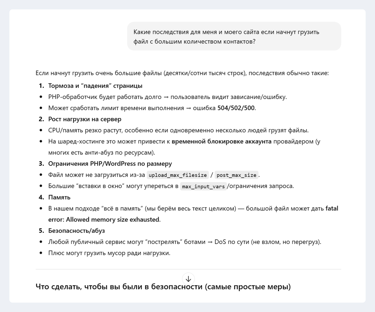 Например, я просил у нейросети определить последствия для моего сайта из-за сделанного сервиса при условии атаки ботов. Такие проверки я устраивал прямо в том же чате, где шла разработка.