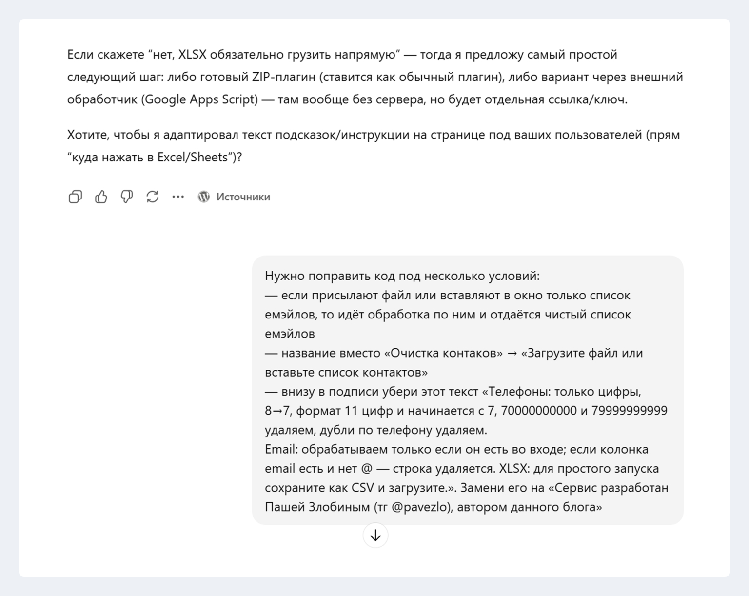 Здесь я использовал даже не отдельный сервис вайбкодинга, а обычный ChatGPT. В итоге у меня получился небольшой продукт, которым я пользуюсь сам и которым делюсь публично.
