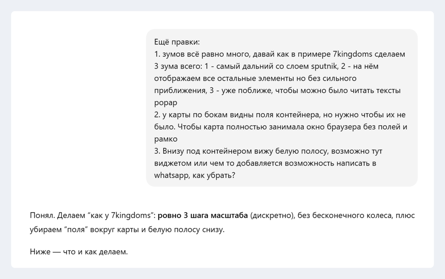 Ты описываешь, что хочешь сделать: механику игры, логику сервиса, ограничения, платформу. На этом этапе часто выясняешь, что в голове было одно, а в реальности нужно уточнять детали.