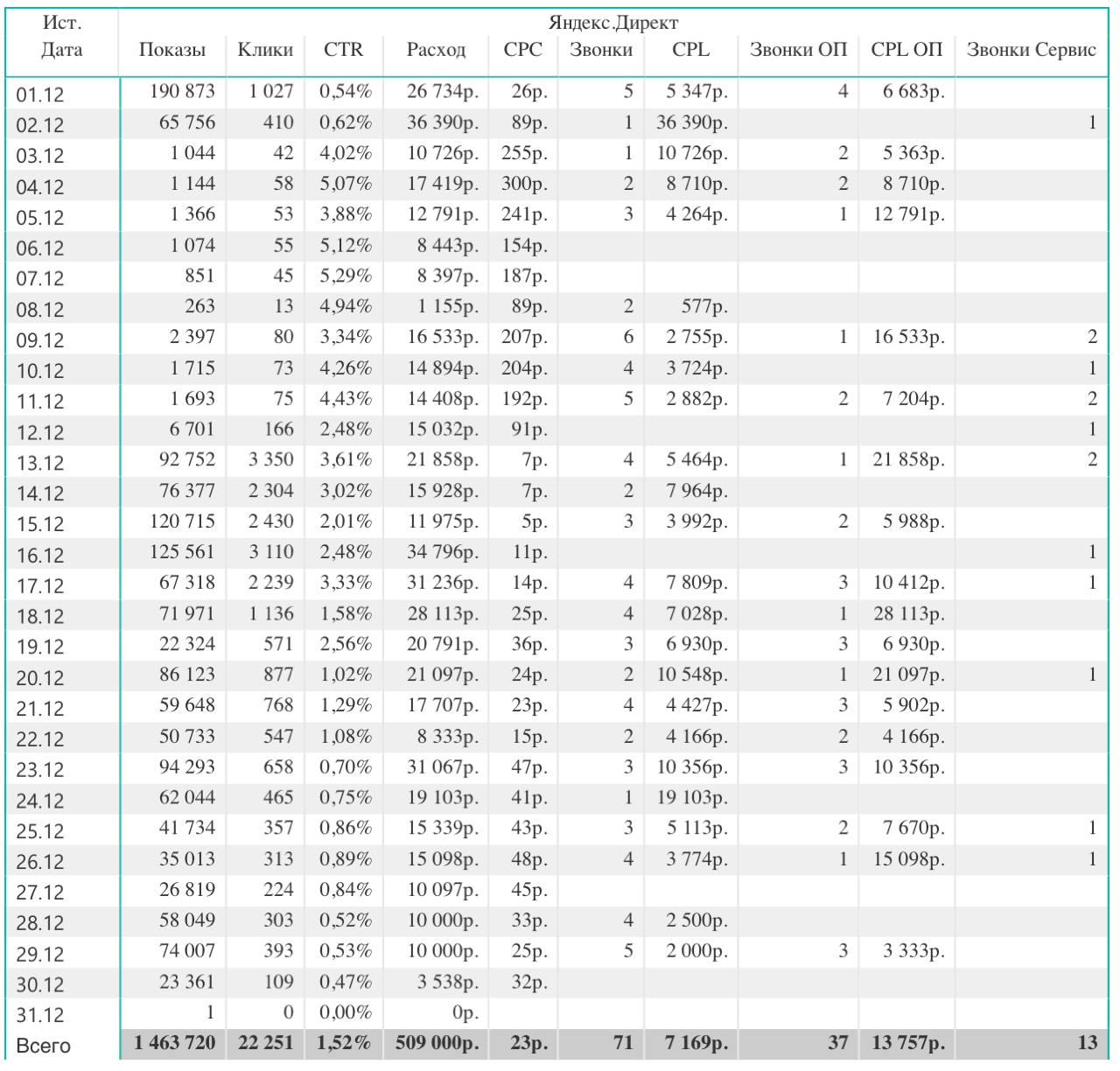 Запущенные кампании не дали ожидаемого результата: за пять дней дилер получил 7 целевых обращений по цене 24 тысячи рублей. Поэтому мы согласовали ряд изменений в декабре и получили кратный рост бюджета, который дал возможность быстрее протестировать и найти точки оптимизации.