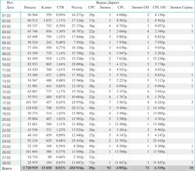 Так, в январе рекламная кампания в РСЯ с переходом на чат-лендинг привлекла лиды по рекордно низкой стоимости — 4 057 рублей, а в феврале — по 3 924 рублей. Товарная кампания на чат-лендинг в феврале дала CPL 4 428 рублей. Поисковая кампания, как и ожидалось, дает самую высокую стоимость целевого обращения — 7 135 рублей. От брендовой кампании на поиске мы отказались вовсе — несмотря на высокий потенциал конверсий, их стоимость окажется слишком высокой.