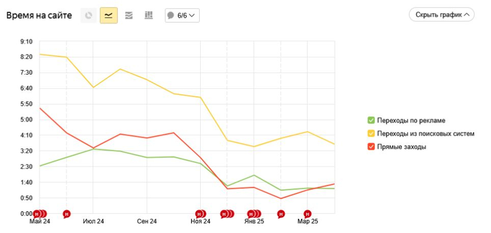 Скриншот из Яндекс Метрики по времени на сайте в зависимости от источника