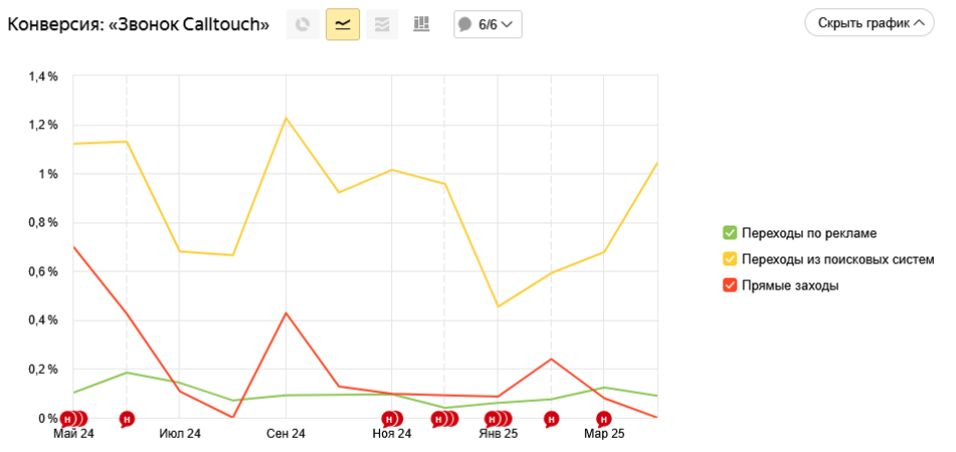 - «Новости» стали получать больше трафика. Несмотря на это, доля конверсий по цели «Звонок Calltouch» для визитов, начинающихся с раздела «Новости», выросла с ноября 2024 года по сравнению с визитами, которые стартовали с других страниц.