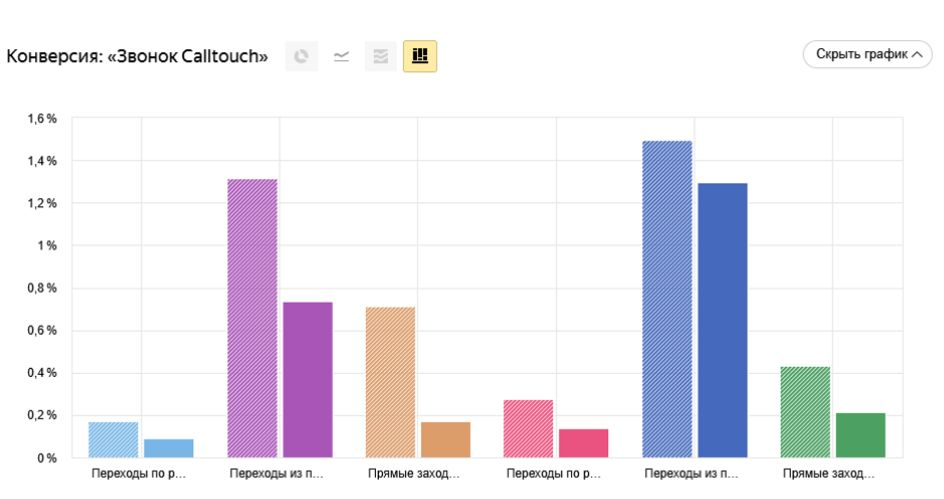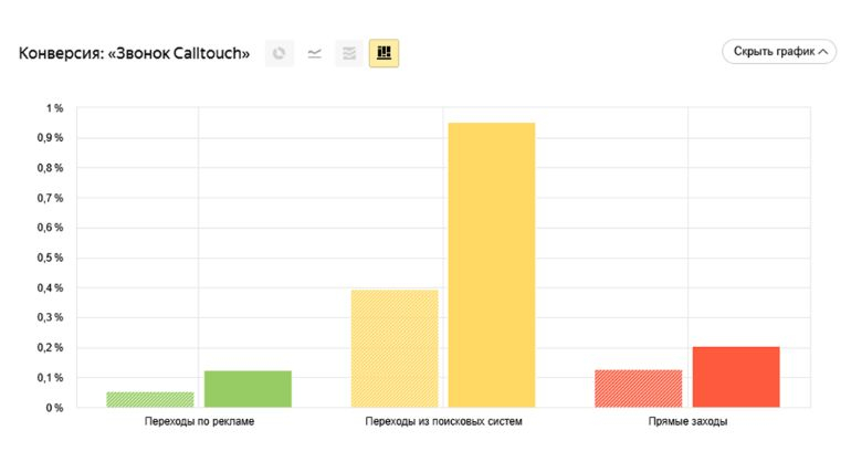 В анализе мы использовали данные счетчика Яндекс Метрики и сегментацию конверсий по цели «Звонок Calltouch». Чтобы найти подходящие гипотезы, мы разбили анализируемые показатели по разным параметрам и сравнили с предыдущим периодом. Наличие расхождений — и есть точка дальнейшего поиска причин и формирования гипотез.