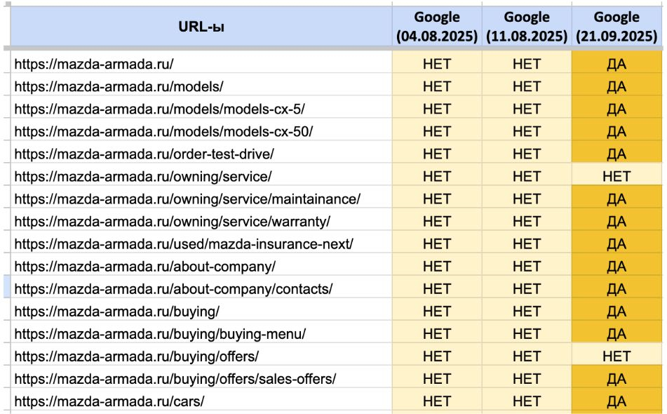 В августе 2025 года к нам обратился дилер Mazda в Ульяновске — сайт mazda-armada.ru, запущенный всего за месяц до начала работ. Используемая CMS — TradeDealer. На тот момент ресурс практически не получал трафика: видимость в Яндекс была минимальной, а в Google сайт и вовсе отсутствовал в индексе. Главная задача — исправить ситуацию и добиться стабильного роста позиций в обеих поисковых системах.